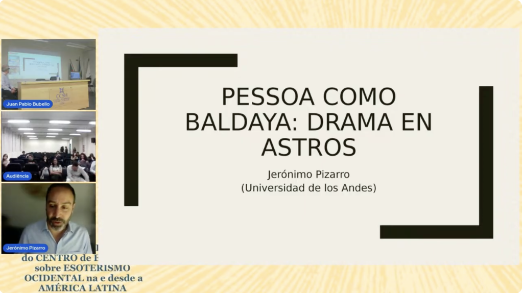 Esta conferencia magistral virtual, organizada en el marco del II Congresso CEEO, tuvo lugar el 12 de noviembre de 2025. En ella, el profesor Jerónimo Pizarro, del Departamento de Humanidades y Literatura de la Universidad de los Andes (Colombia), presentó su análisis sobre la relación de Fernando Pessoa con la astrología a través de su autor ficticio Rafael Baldaya. Durante la sesión, Pizarro exploró la creación de Baldaya como astrólogo y la división de la obra de Pessoa en ortónima y heterónima (Alberto Caeiro, Ricardo Reis y Álvaro de Campos; con mención especial a António Mora).